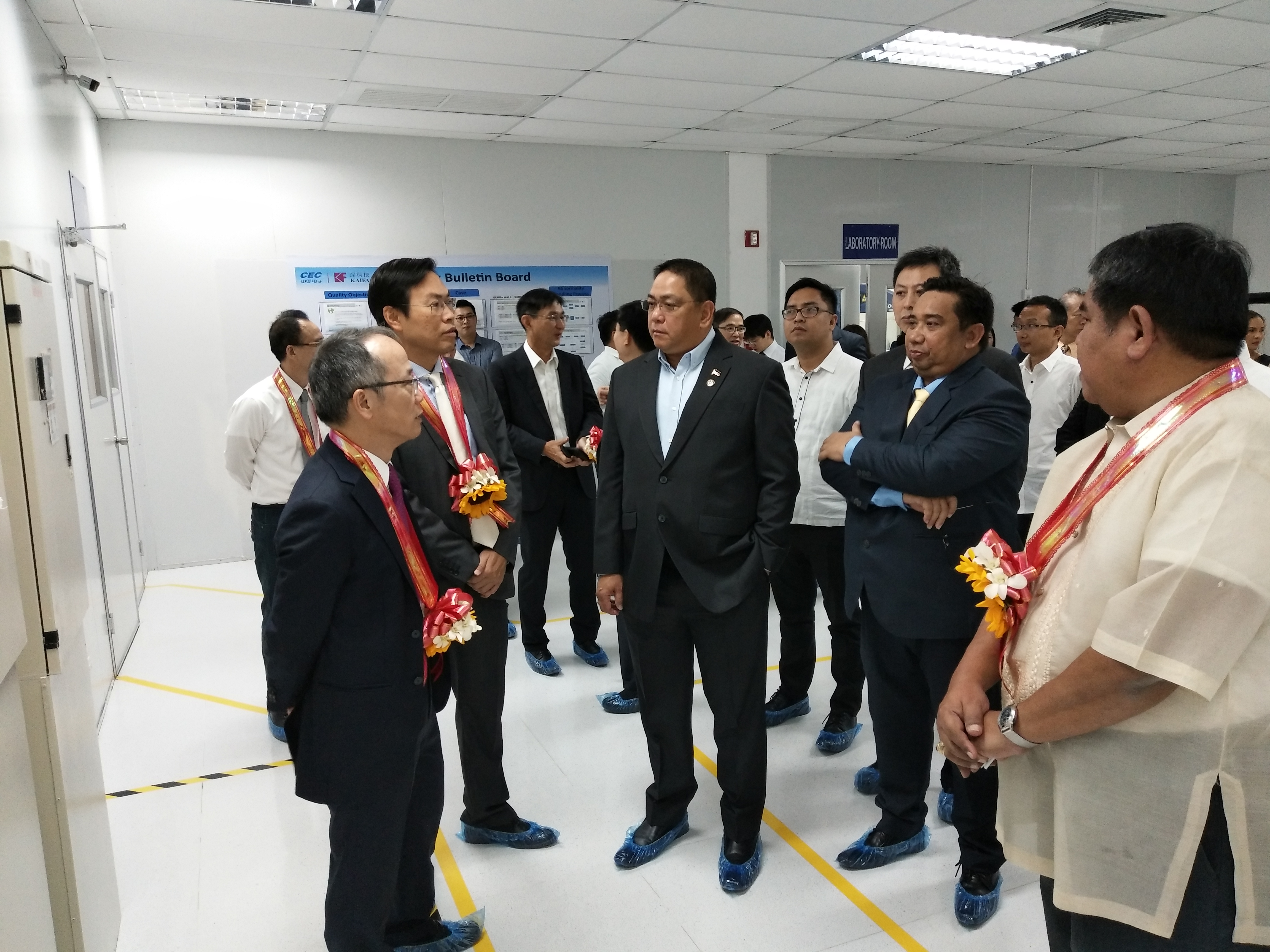 剪彩儀式結束后,公司領導、菲律賓政府部門及機構領導和客戶代表等一起參觀了菲律賓公司的生產車間,實地了解公司生產線的布局情況、工序與產能。公司黨委委員、總裁辦公室總監吳鴻彬、盛龍,財務部總監彭秧,物業管理中心總監涂國求,商業與工業產品事業部總經理周浩、袁培志、曹晶,香港公司總經理李文勝參加活動.